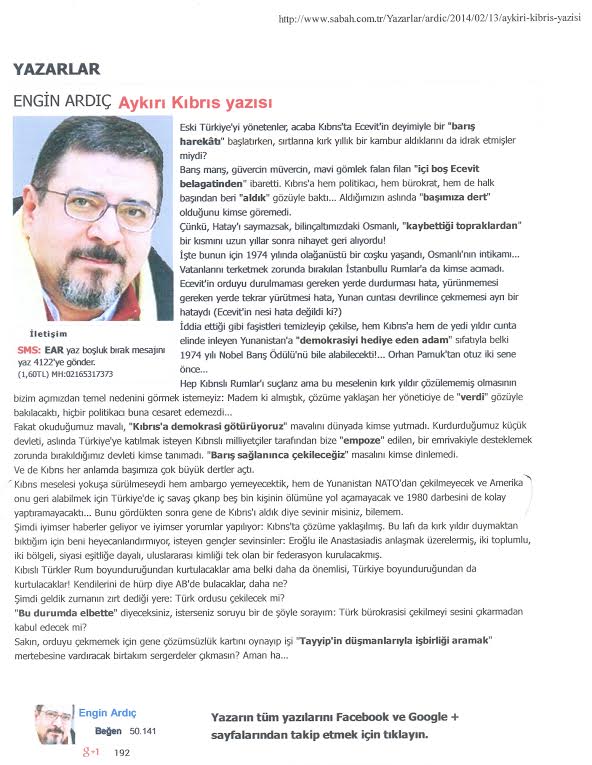 Συγκεκριμένα ο γνωστός αρθογράφος της Sabah, Engin Ardıç, ο οποίος πάντα διακρίνονταν για τις θαρραλέες δημόσιες τοποθετήσεις του, σε ένα άρθρο κόλαφος, ειδικά για την ελληνική και κυπριακή ηγεσία, με τον χαρακτηριστικό τίτλο, «Aykırı Kıbrıs yazısı», δηλαδή, «Διαφορετική άποψη για το Κυπριακό», αναφέρει ξεκάθαρα ότι και αυτή την φορά θα αποτύχουν όλες οι προσπάθειες για την επίλυση του κυπριακού, οι οποίες μάλιστα πατρονάρονται από εξωτερικούς παράγοντες, αν δεν αποχωρήσουν πρώτα τα τουρκικά στρατεύματα από την Κύπρο. Ο Engin Ardıç, με πολύ εντυπωσιακό ομολογουμένως τρόπο για Τούρκο αρθογράφο, ειρωνεύεται την «ιστορική» δήλωση που είχε κάνει ο πρωθυπουργός και «αρχιτέκτονας» της τουρκικής εισβολής στην Κύπρο, Bülend Eçevit, ότι η εισβολή ήταν μια, «Barış Harekatı», δηλαδή μια «Ειρηνική Επιχείρηση». Ο Τούρκος αρθρογράφος την σχολιάζει ειρωνικά γράφοντας ότι θα έπρεπε να δοθεί το… νόμπελ ειρήνης στον Ετσεβίτ, 32 χρόνια πριν από τον γνωστό Τούρκο συγγραφέα, Ορχάν Παμούκ, που ήταν ο πρώτος Τούρκος που πήρε νόμπελ στον τομέα της λογοτεχνίας. Στη συνέχεια ο αρθρογράφος αναφέρει ότι η τουρκική επέμβαση στην Κύπρο έφερε μόνο δεινά στην Τουρκία, δημιούργησε πολλά οικονομικά προβλήματα με ένα κατοχικό στρατό που έπρεπε η τουρκική οικονομία να συντηρεί επί πολλά χρόνια, ένα κράτος που ουσιαστικά ήταν παράρτημα της Τουρκίας και συντηρούνταν και αυτό από την τουρκική οικονομία, απορρίπτοντας έτσι κάθε επίσημη τουρκική άποψη για την ύπαρξη του ψευδοκράτους. Αλλά το πιο εντυπωσιακό είναι αυτό που ισχυρίζεται ότι εξ’ αιτίας της τουρκικής εισβολής στην Κύπρο, προκλήθηκε εκείνη την δεκαετία, δηλαδή την δεκαετία του εβδομήντα, μια μεγάλη εσωτερική αναταραχή στην Τουρκία με καθημερινές πολιτικές δολοφονίες, με ένα ουσιαστικά εμφύλιο πόλεμο που οδήγησε στο στρατιωτικό πραξικόπημα του 1980, το οποίο, κατά τον Τούρκο αρθογράφο, πήγε την Τουρκία και την δημοκρατία πολλά χρόνια πίσω.