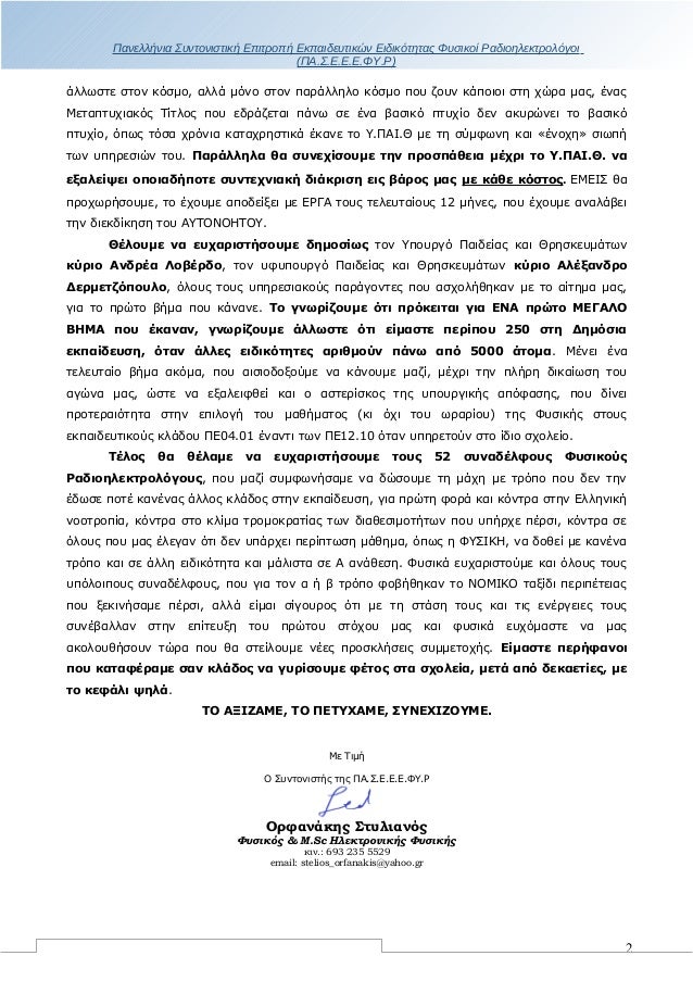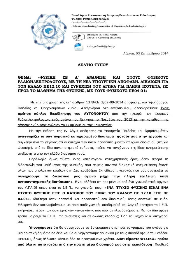 «ΦΥΣΙΚΗ ΣΕ Α΄ ΑΝΑΘΕΣΗ ΚΑΙ ΣΤΟΥΣ ΦΥΣΙΚΟΥΣ ΡΑΔΙΟΗΛΕΚΤΡΟΛΟΓΟΥΣ, ΜΕ ΤΗ ΝΕΑ ΥΠΟΥΡΓΙΚΗ ΑΠΟΦΑΣΗ. ΔΙΚΑΙΩΣΗ ΓΙΑ ΤΟΝ ΚΛΑΔΟ ΠΕ12.10 ΚΑΙ ΣΥΝΕΧΙΣΗ ΤΟΥ ΑΓΩΝΑ ΓΙΑ ΠΛΗΡΗ ΙΣΟΤΗΤΑ, ΩΣ ΠΡΟΣ ΤΟ ΜΑΘΗΜΑ ΤΗΣ ΦΥΣΙΚΗΣ, ΜΕ ΤΟΥΣ ΦΥΣΙΚΟΥΣ ΠΕ04.01»