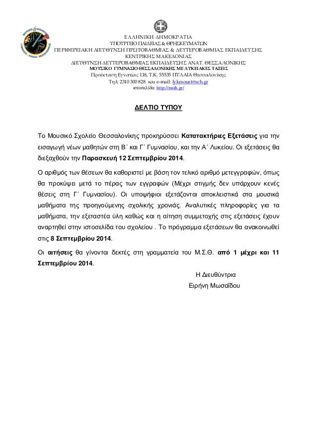 ΔΕΛΤΙΟ ΤΥΠΟΥ: ΚΑΤΑΤΑΚΤΗΡΙΕΣ εξετάσεις στο Μ.Σ.Θ. το Σεπτέμβριο 2014